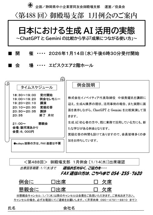 静岡県中小企業家同友会御殿場支部 〒412-0038 静岡県御殿場市駒門1-158 工業振興センター内 TEL:054-253-6130 FAX:054-255-7620 お問い合わせはこちら
